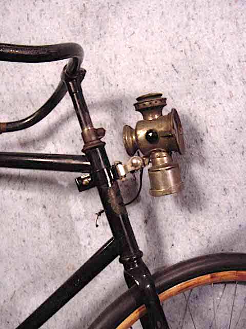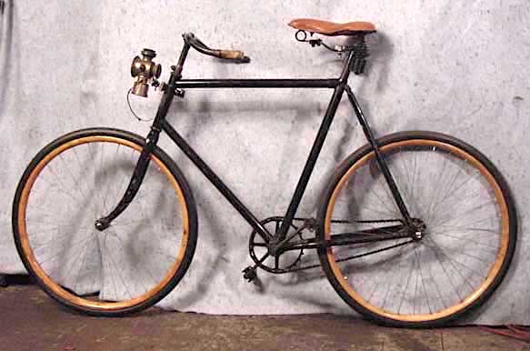 With cottered cranks, inch-pitch block chain, fixed-gear drive, wood rim wheels, Neverout headlamp.