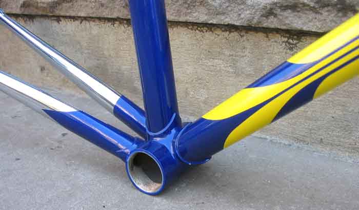 blue/yellow with chrome forks and 3/4 stays, 54cm (c-t) x 55cm,
